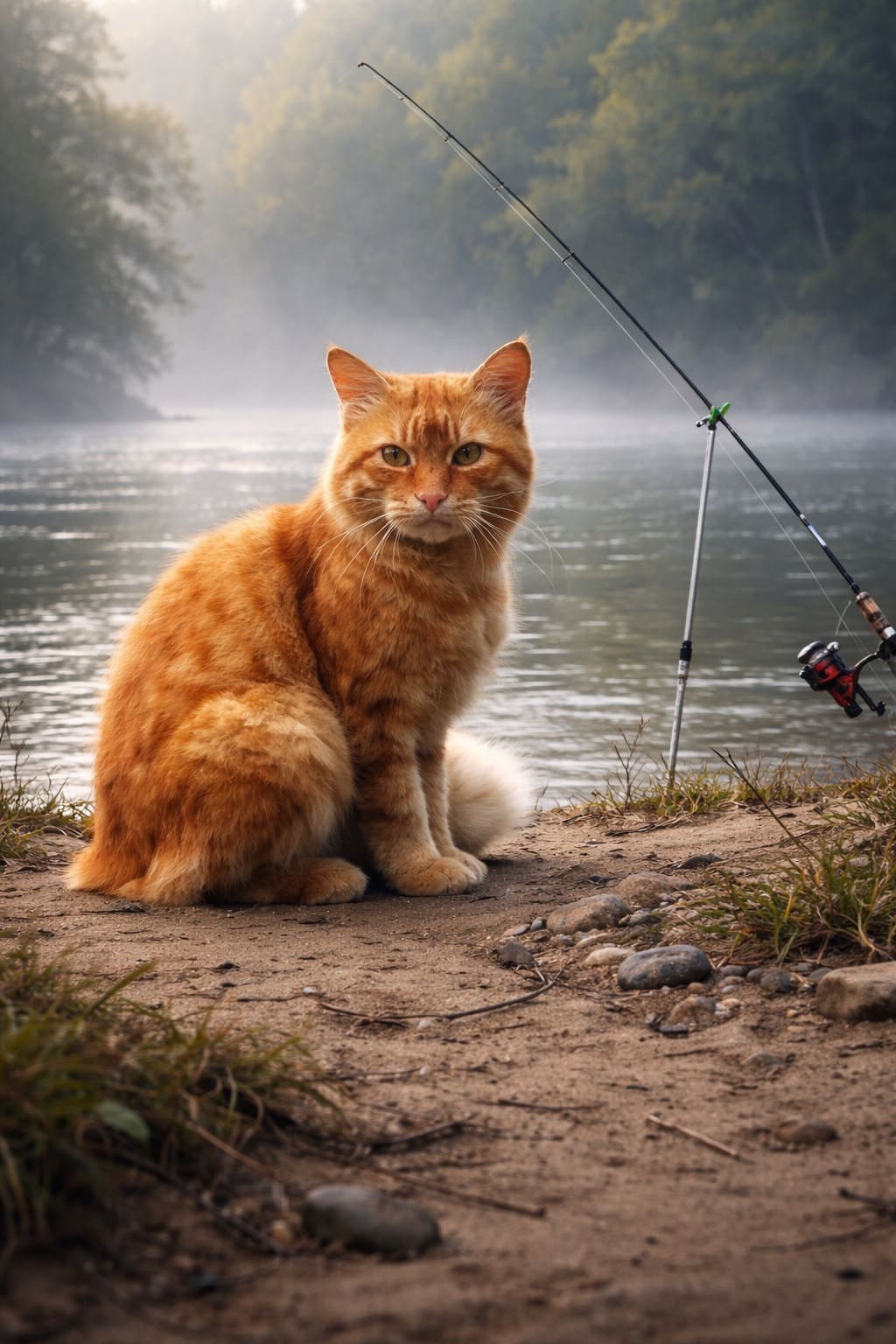 Кот беспокойно вскочил, мальчик подсек и выбросил на берег приличных размеров рыбину, которая принялась выписывать кренделя, пытаясь вернуться в реку.