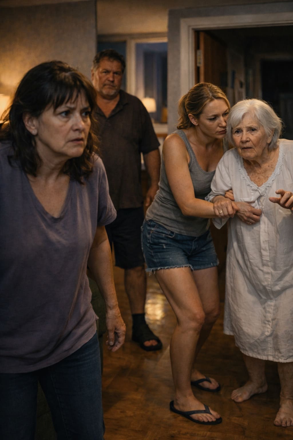 Зинаида Петровна проснулась от шума. Растерянная, испуганная, она вышла в коридор в ночной рубашке.
