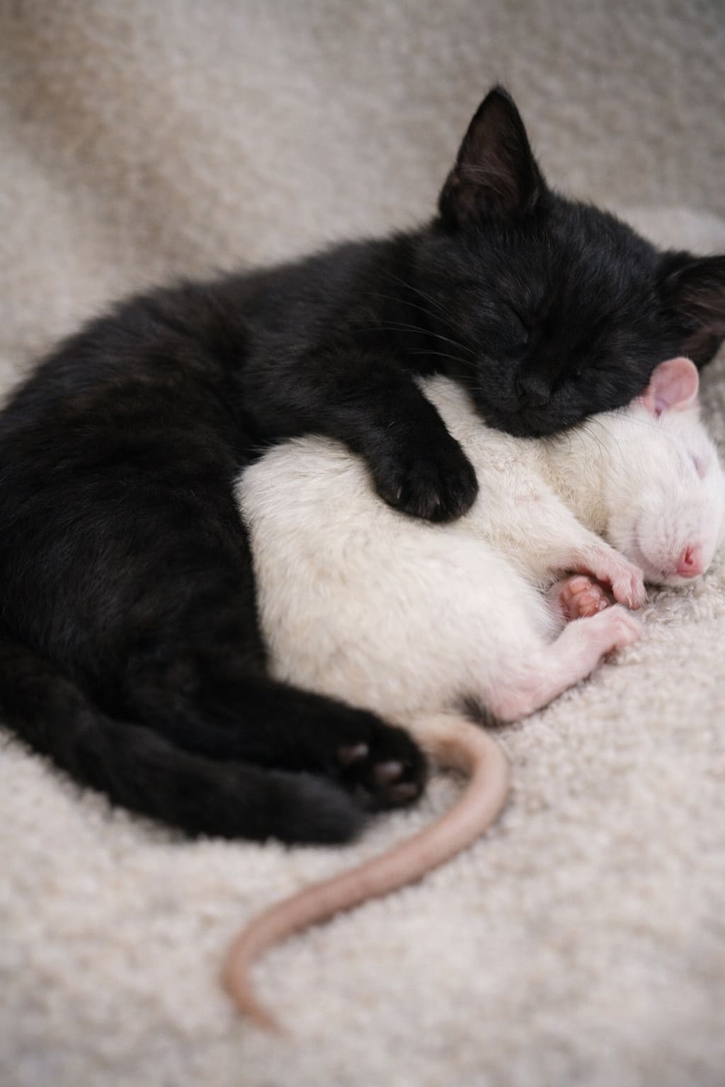 Этот случай был всех горше. Её любимый черный котёнок спал в обнимку с крысёнышем. Они сели рядышком и, продирая заспанные глазки, с интересом смотрели на маму, которая почему-то кричала.
