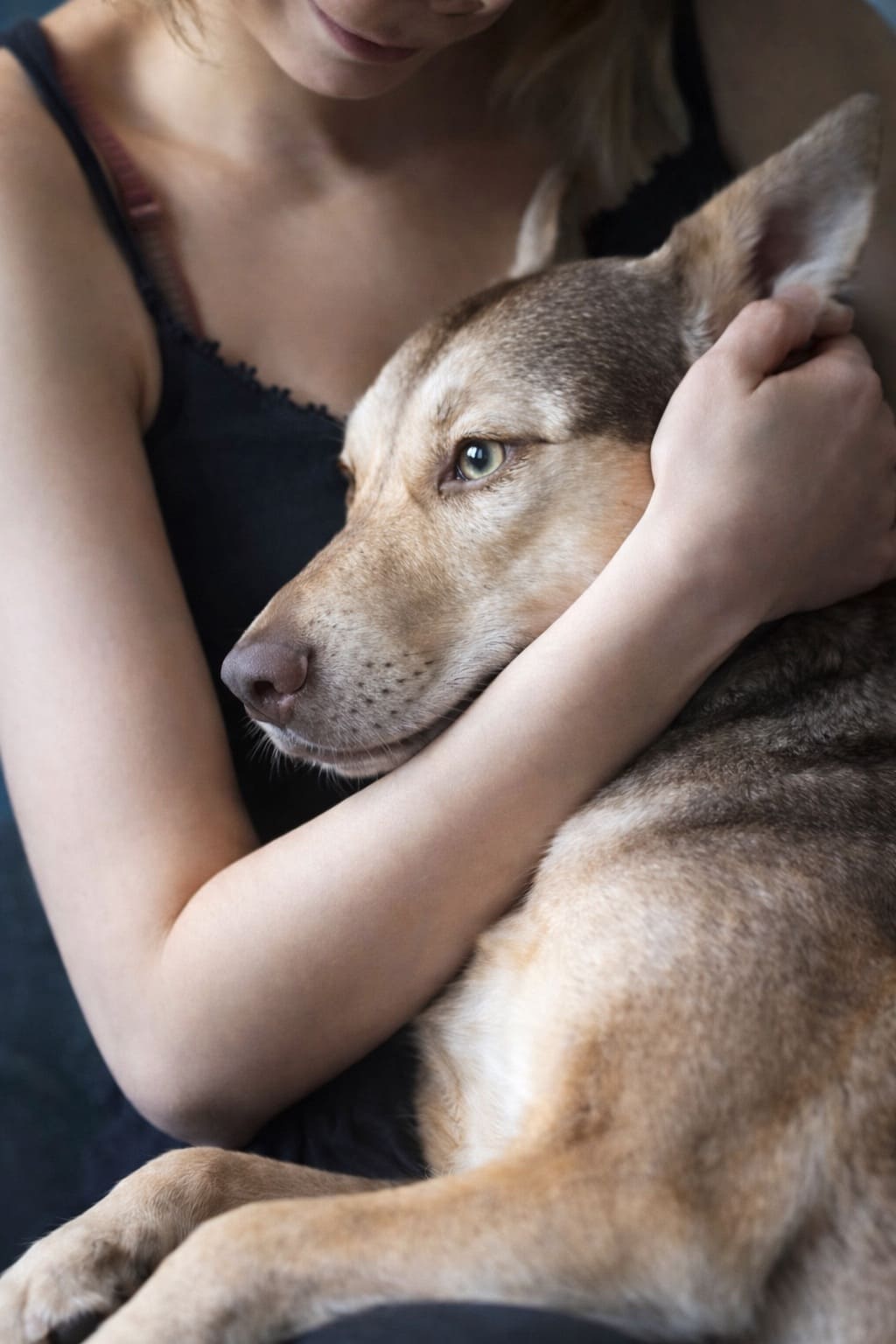 И пришла фотография. На ней была средних размеров собака, кобель, молодой, у волонтёра, живёт в вольере со своими сородичами. Бежевый, с тёмным окрасом на спине и медовыми глазами. И сообщение: «Это он».