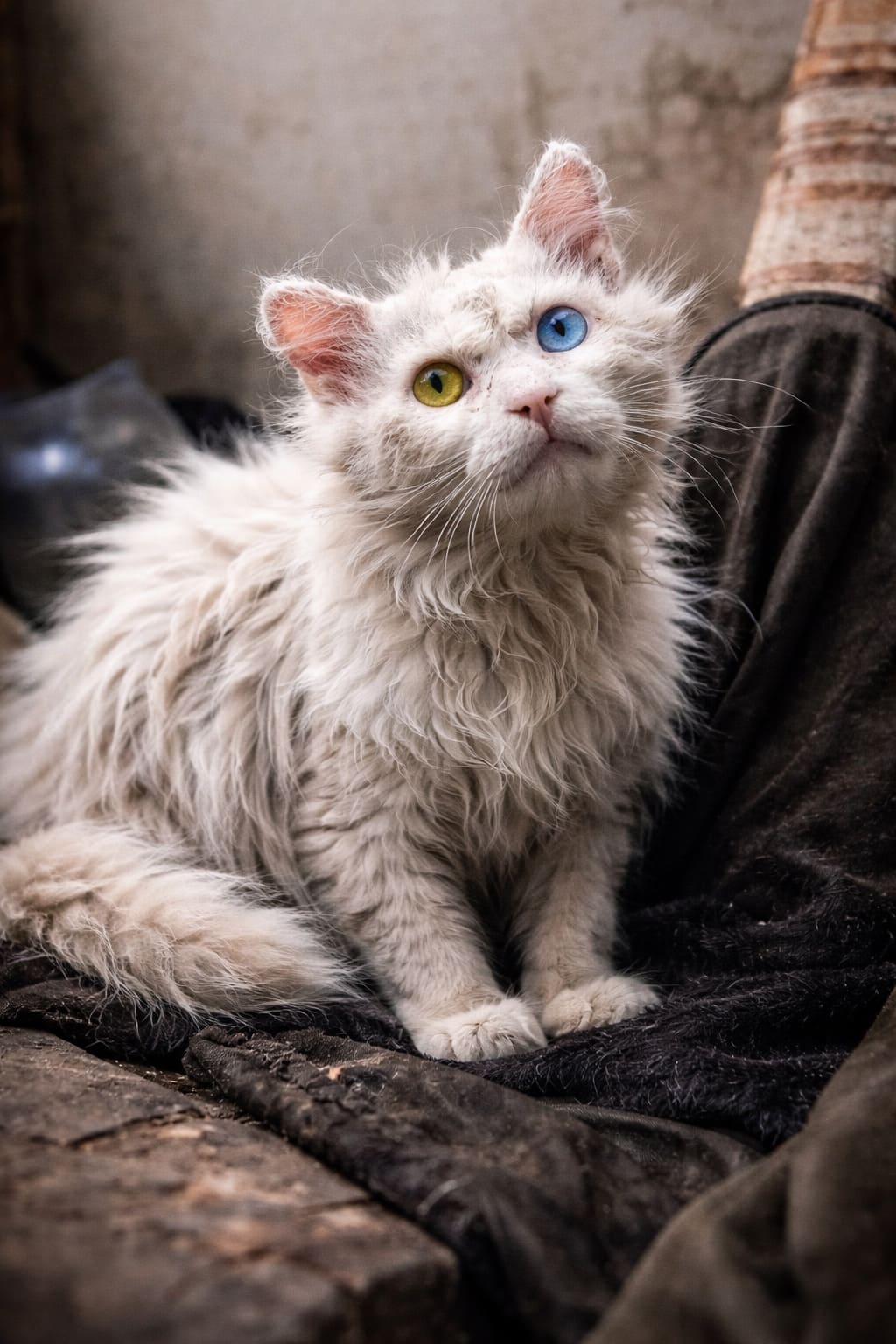 Бродяга, жалуясь на жизнь, протягивала к девушке свои воспалённые лапы. Самым удивительным в этой кошке были её разные глаза — один янтарно жёлтый, другой серо-голубой, они оба молили о пощаде и помощи.