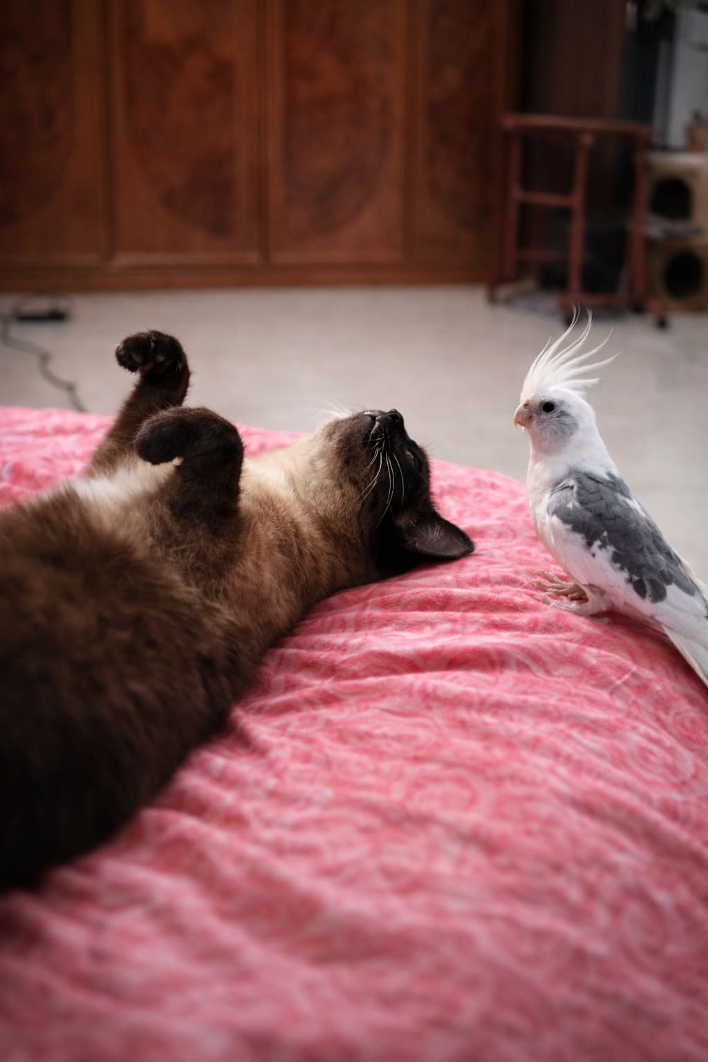 Из-за незакрытой двери в комнату, где они жили, овчарки ворвались в нашу часть квартиры и погнались за несчастным Томочкой, который, естественно, отвык уже от такого. Он примчался в спальню, где я, лежа на кровати, смотрел телевизор, а Кеша сидел на своей клетке и чистил пёрышки.