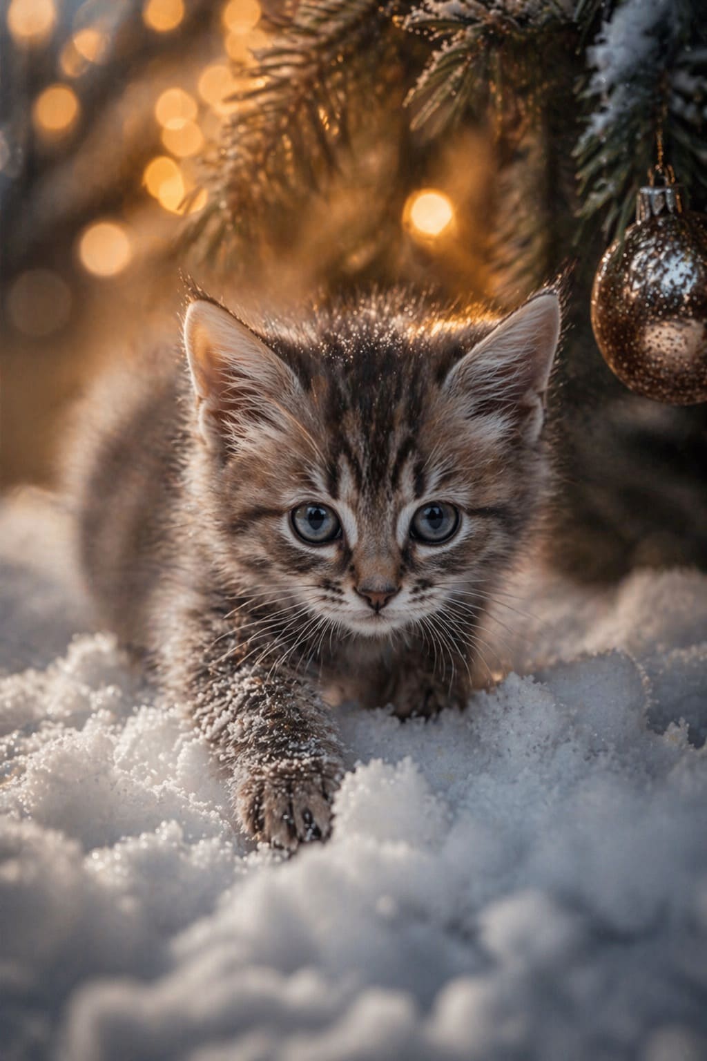 Его густая шерсть отливала золотом в свете вечерних фонарей, а усы подрагивали от лёгкого морозного ветерка. Он неспешно обходил праздничное дерево, с интересом его рассматривая.