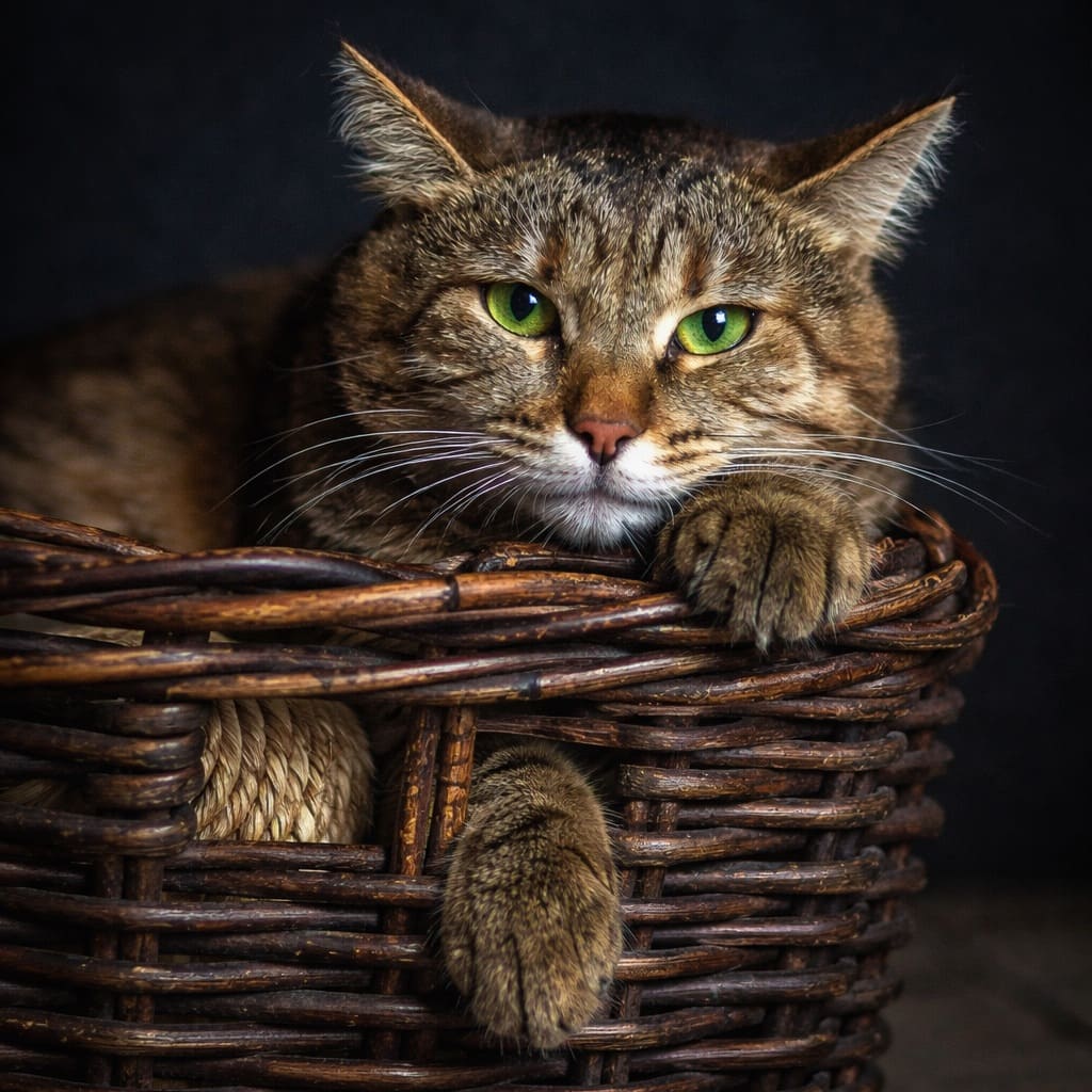 Внимание привлекла бабушка, скромно стоящая у стены, опрятно одетая, у ног – плетеная корзина. В ней чинно сидел старый полосатый котик, исподлобья оглядывая проходящих.