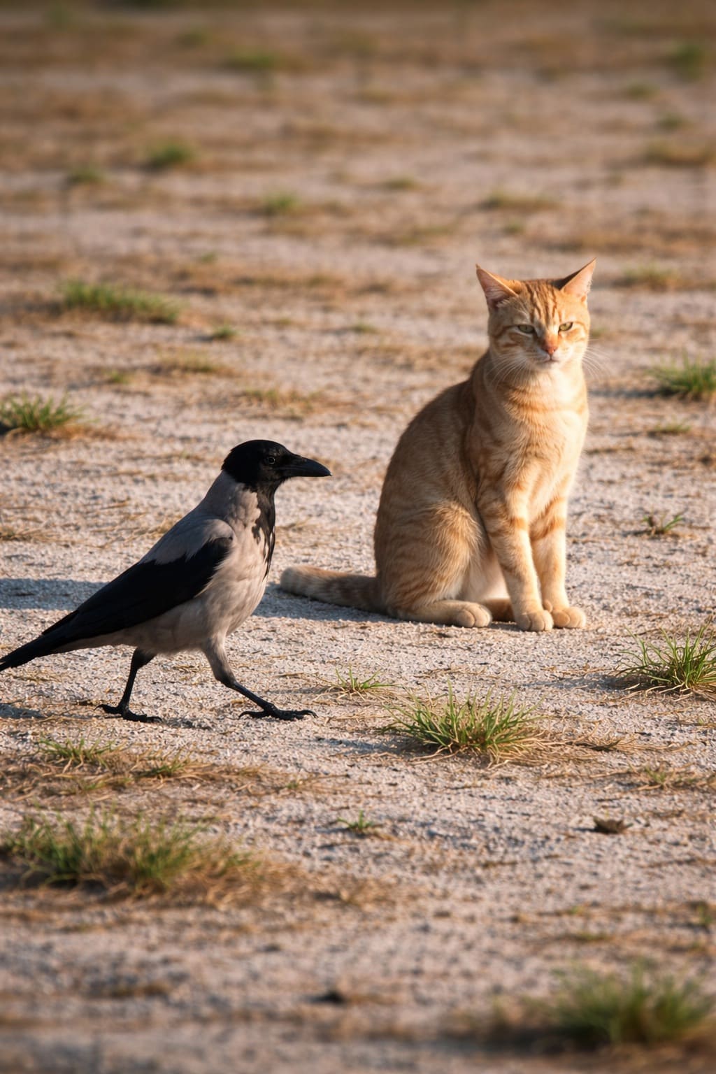 Ворона, одобрительно каркнув, попыталась смахнуть скупую воронью слезу правой лапой, но потом вспомнила, что птицы не плачут. Но Рыжик вдруг вырвался из рук девочки и, запрыгнув на скамейку, сел рядом с вороной.