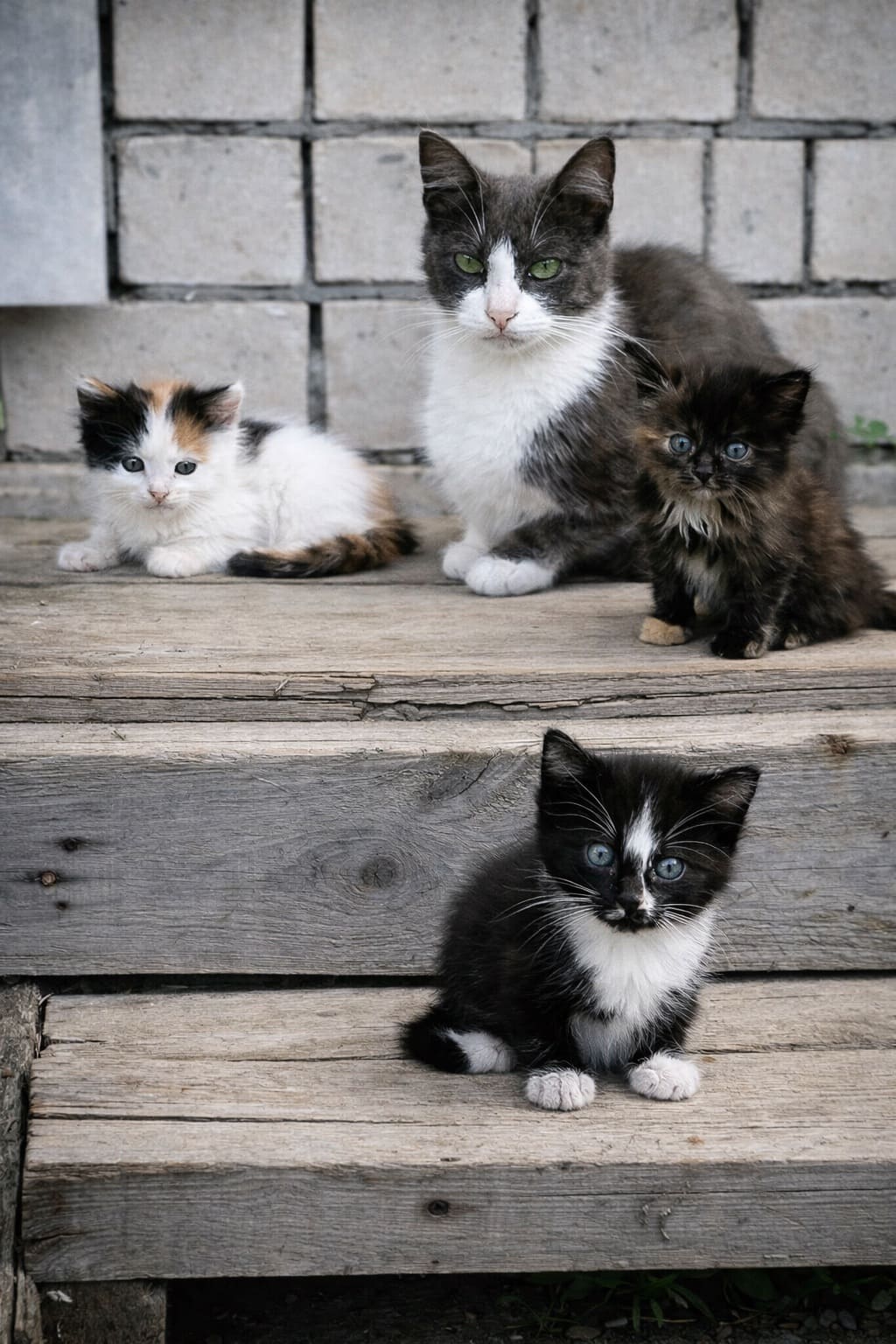 Но человек уже бежал вниз по лестнице. Он выскочил из подъезда, подхватил на руки трёх котят и их маму и, дыхнув на них перегаром, помчался наверх в свою квартиру, перескакивая через три ступеньки…
