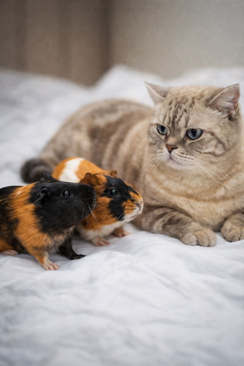Свинки бросились к коту. Они решили, что тому стало плохо. Они встали на задние лапки и маленькими передними лапками с розовыми пальчиками стали гладить его.