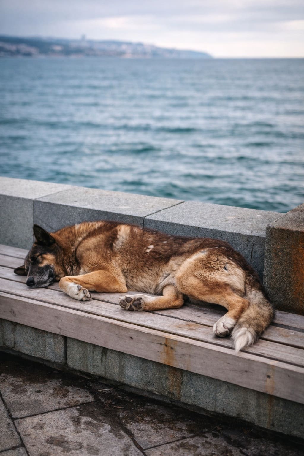 Собака лежала на набережной. Она давно ничего не ела и живот противно урчал. Собственно говоря, он почти прижался к позвоночнику. Втянулся, и стали видны рёбра на худом грязном теле. Набережная, где пёс свернулся калачиком у одного из пирсов, была полна людей.