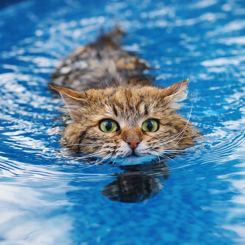 Кот вдруг разогнался со всей своей кошачьей мочи, оттолкнулся от края бассейна задними лапами, подпрыгнул и, пролетев добрых четыре метра, плюхнулся прямо посреди купающихся…
