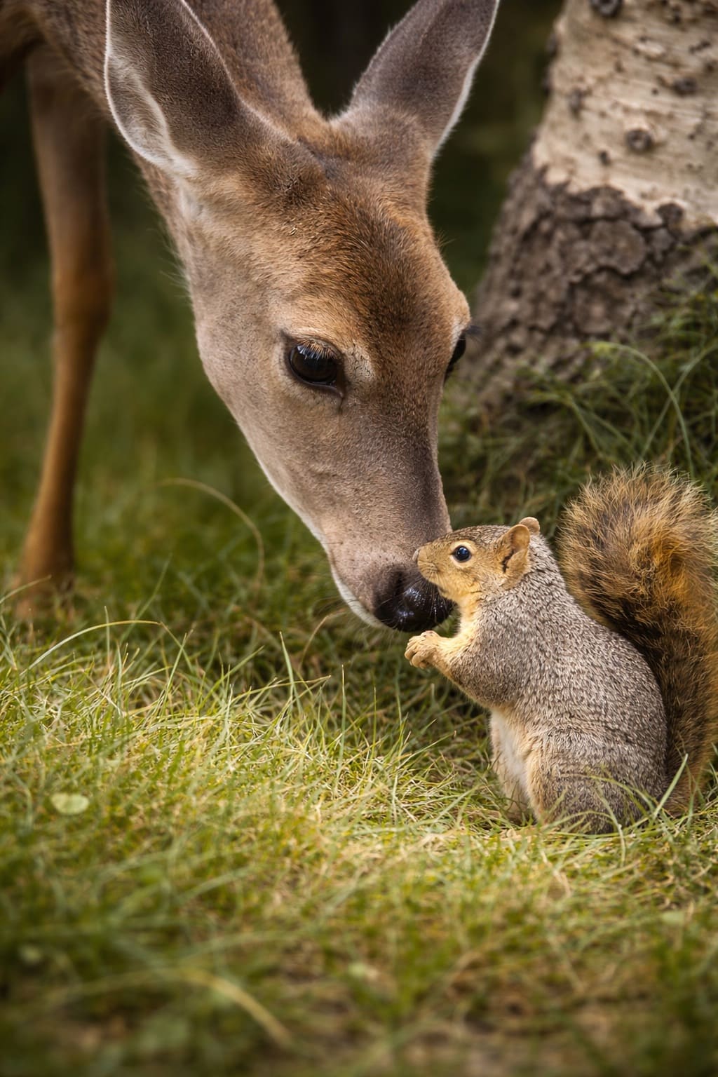 Зайцы, тем временем, толкались под ногами у косуль, и они опускали головы вниз и разглядывали пушистых малышей. Но те, не оценив такое внимание, всё время поворачивались к косулям своими хвостиками.