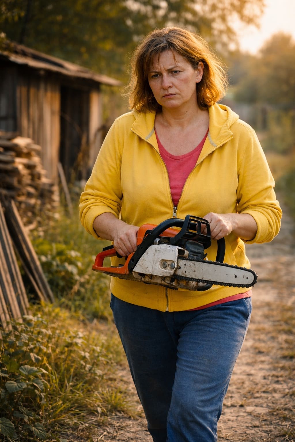 Тамара шла по тропинке вдоль забора с бензопилой в руках, и это явно был не самый лучший момент в ее жизни.